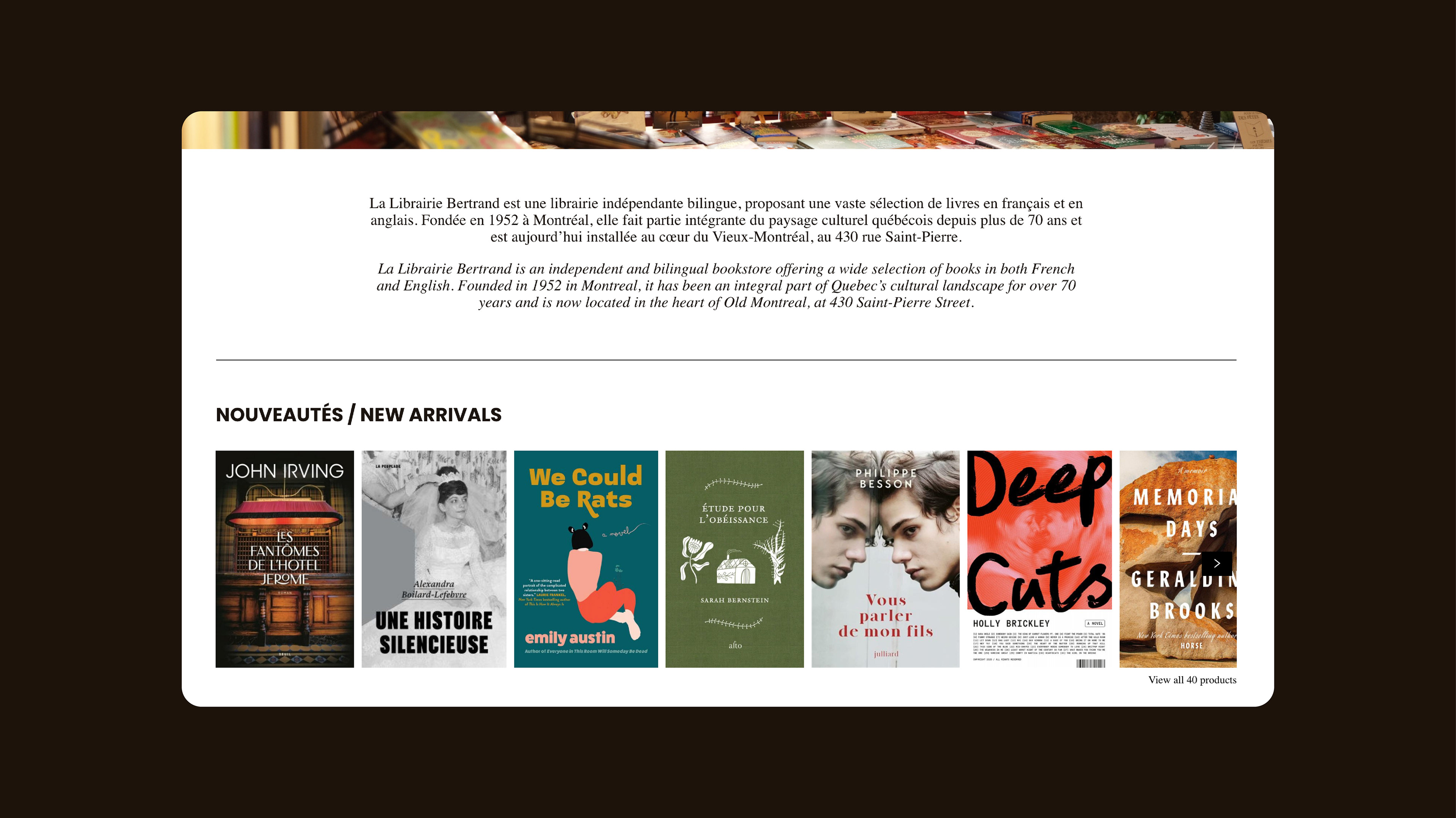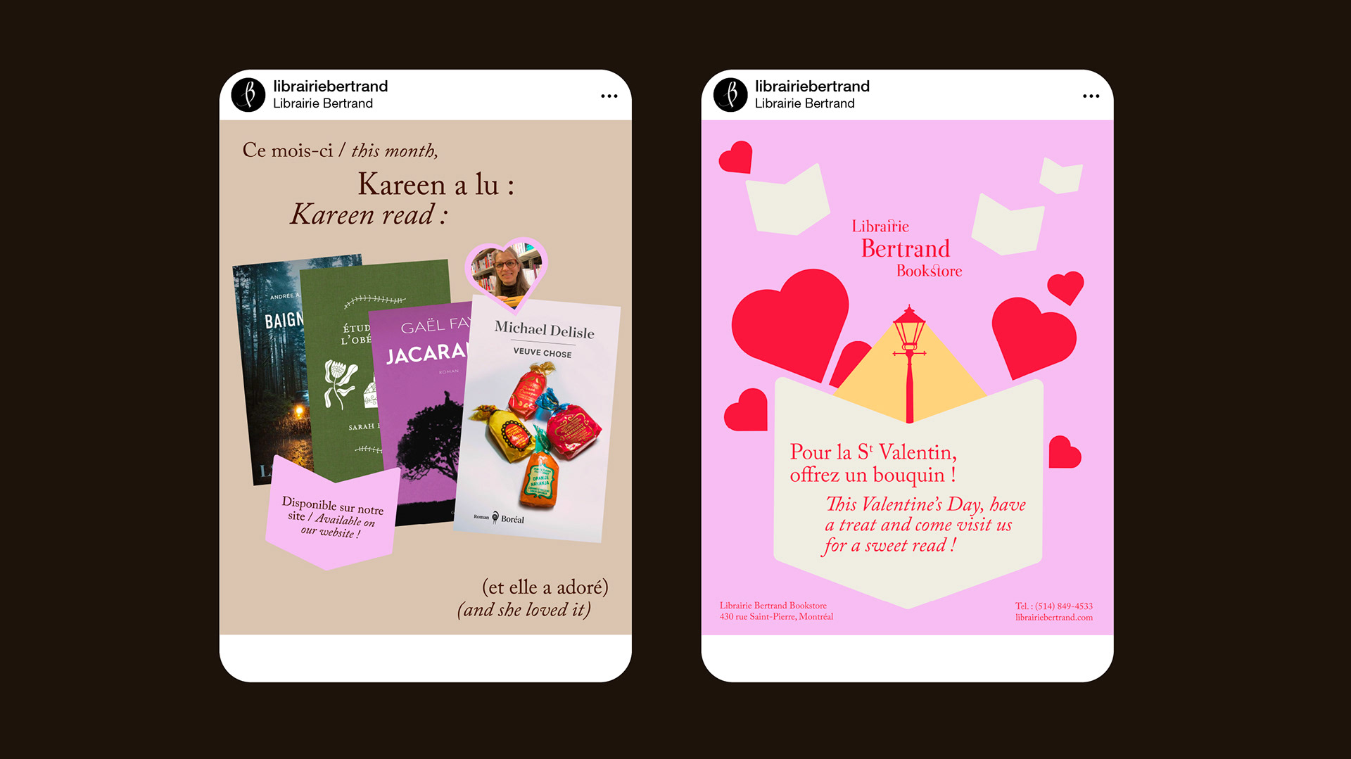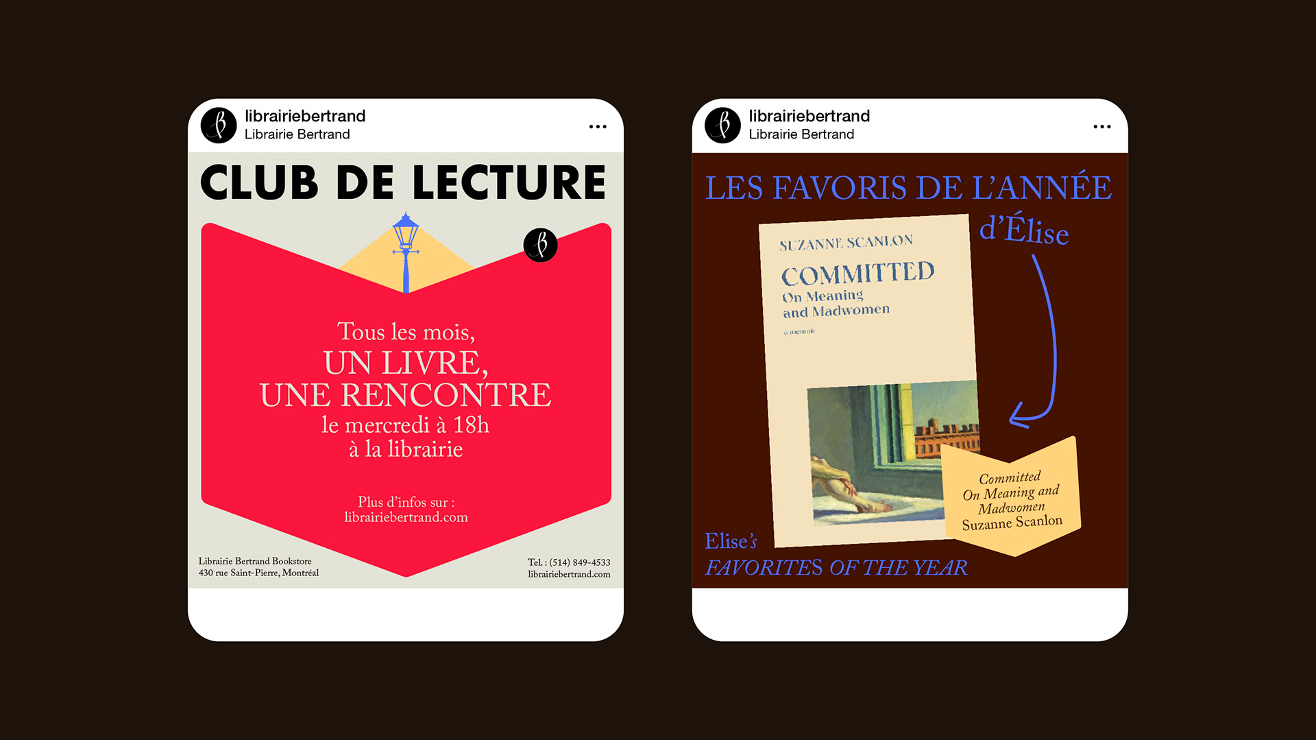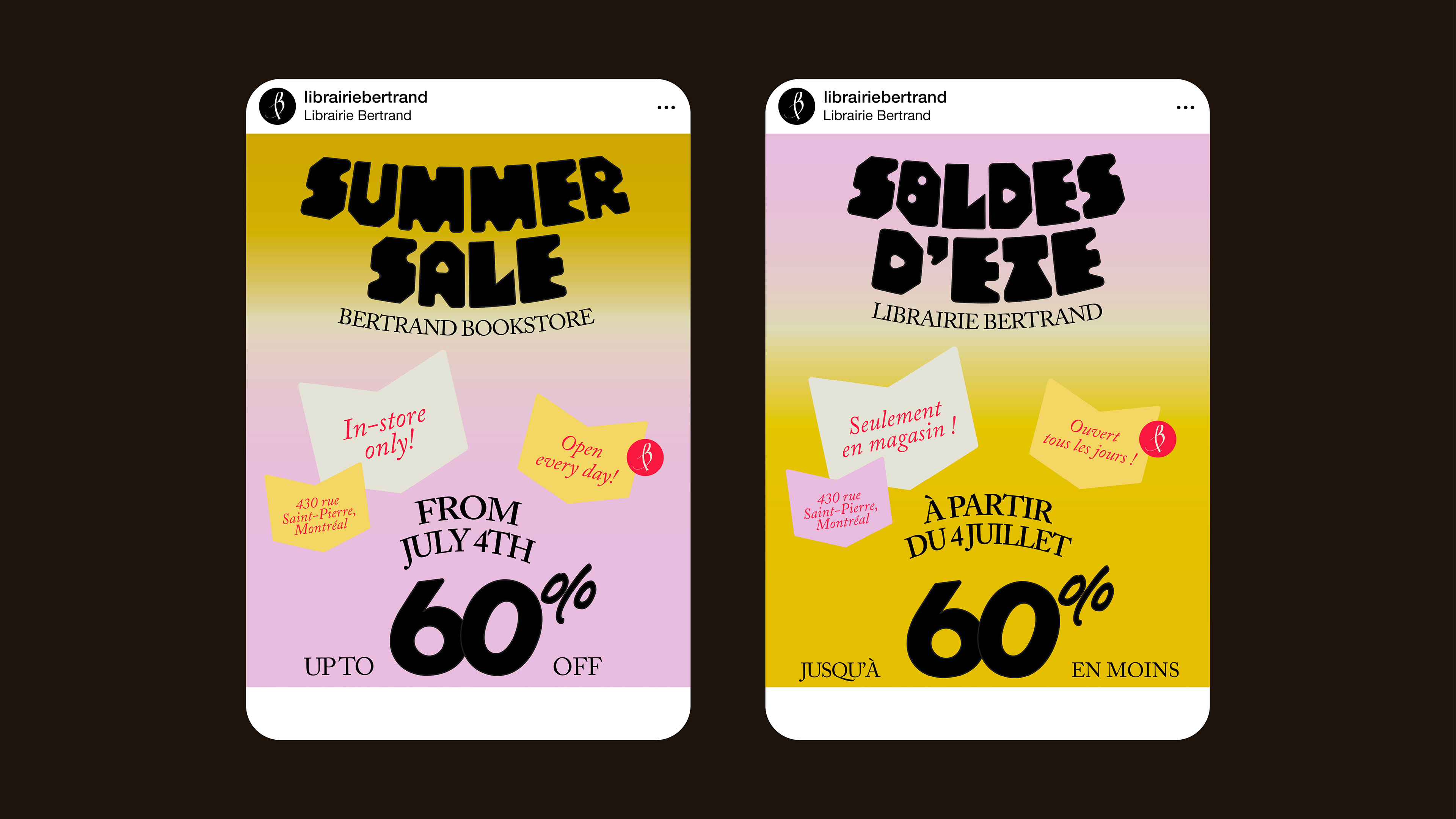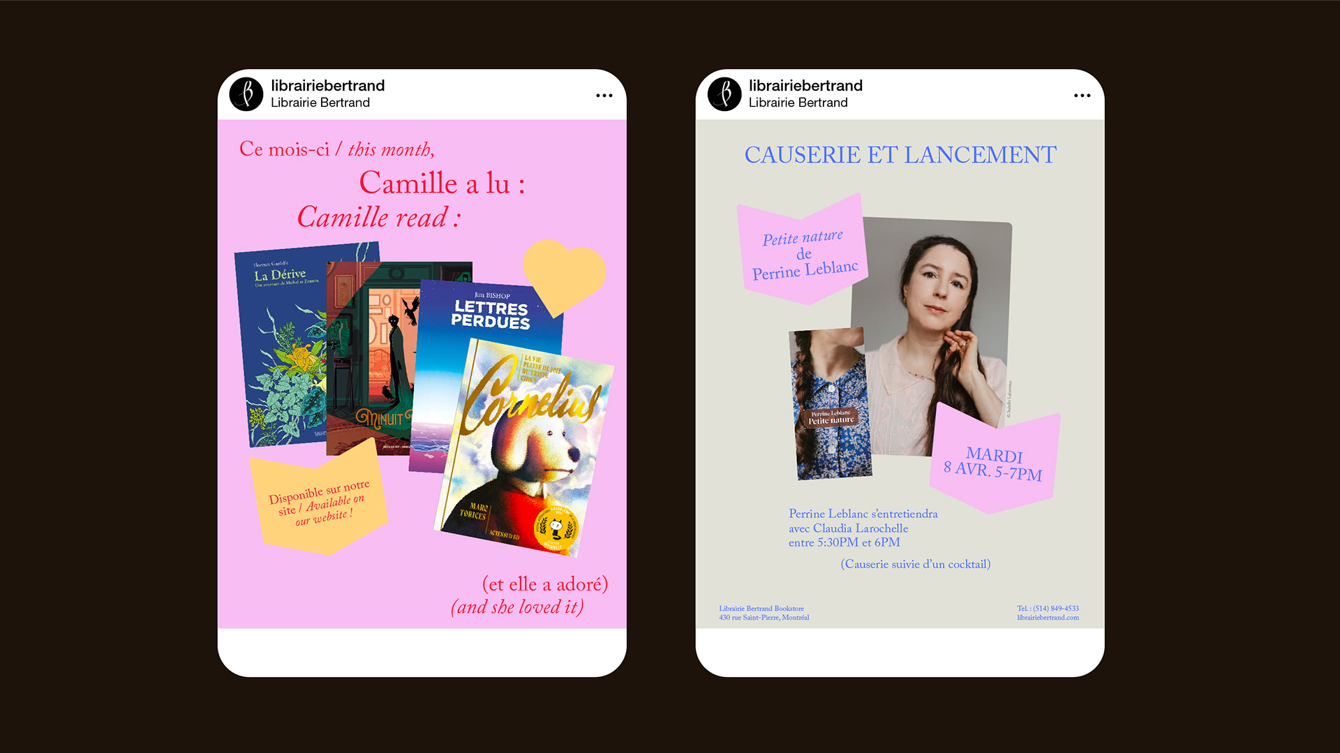 While working at Librairie Bertrand, a bookstore in Old Montreal, I updated the visual identity to make it more modern and joyful, and developed systems that enabled bookseller co-workers to create visuals independently. I was also responsible for the bookstore’s overall promotion, including stationery, event posters, signage, social media content, website design and management, as well as window displays.