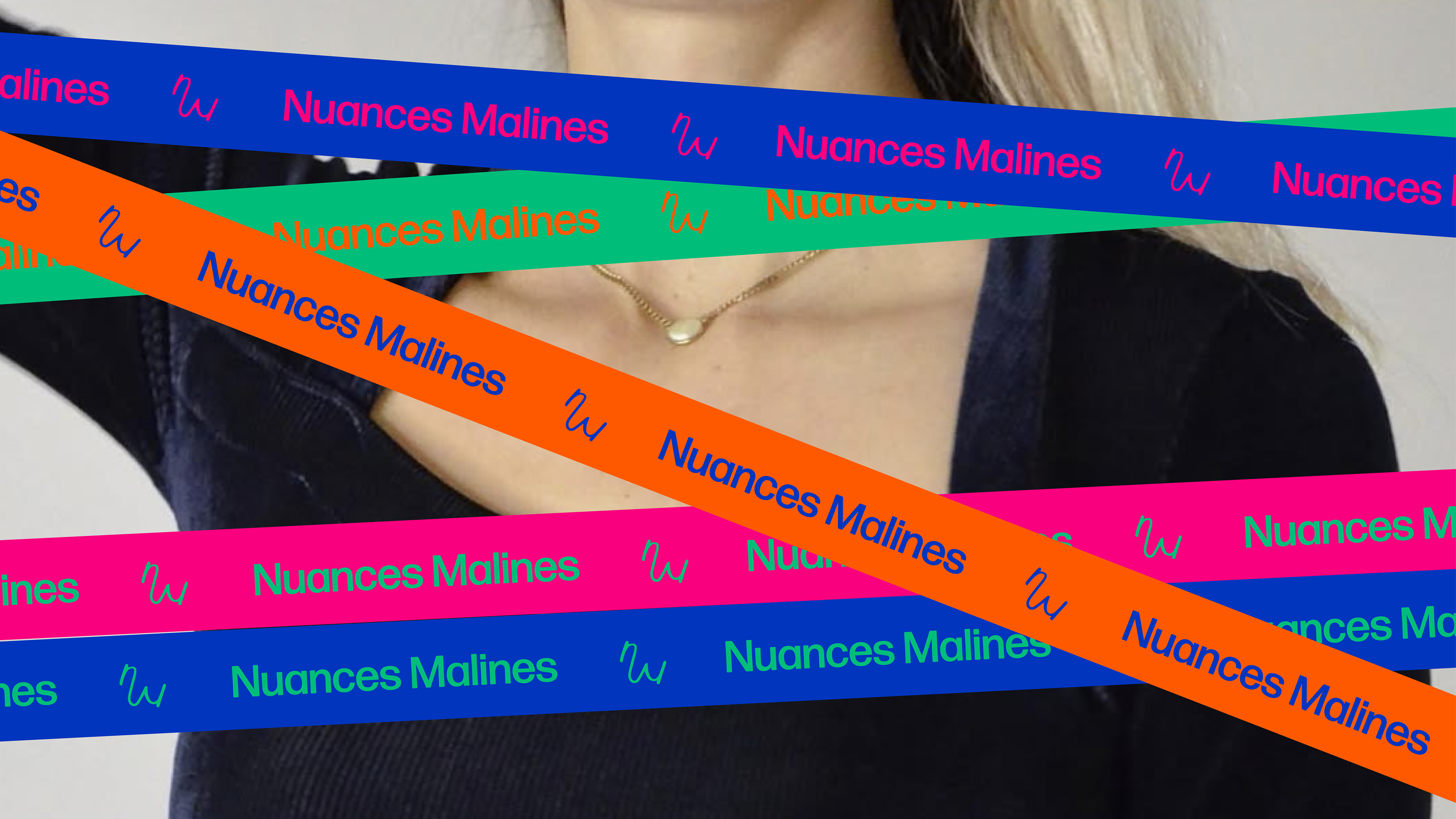 The identity extends across communication materials through “NM” branded ribbons that frame images as graphic elements.